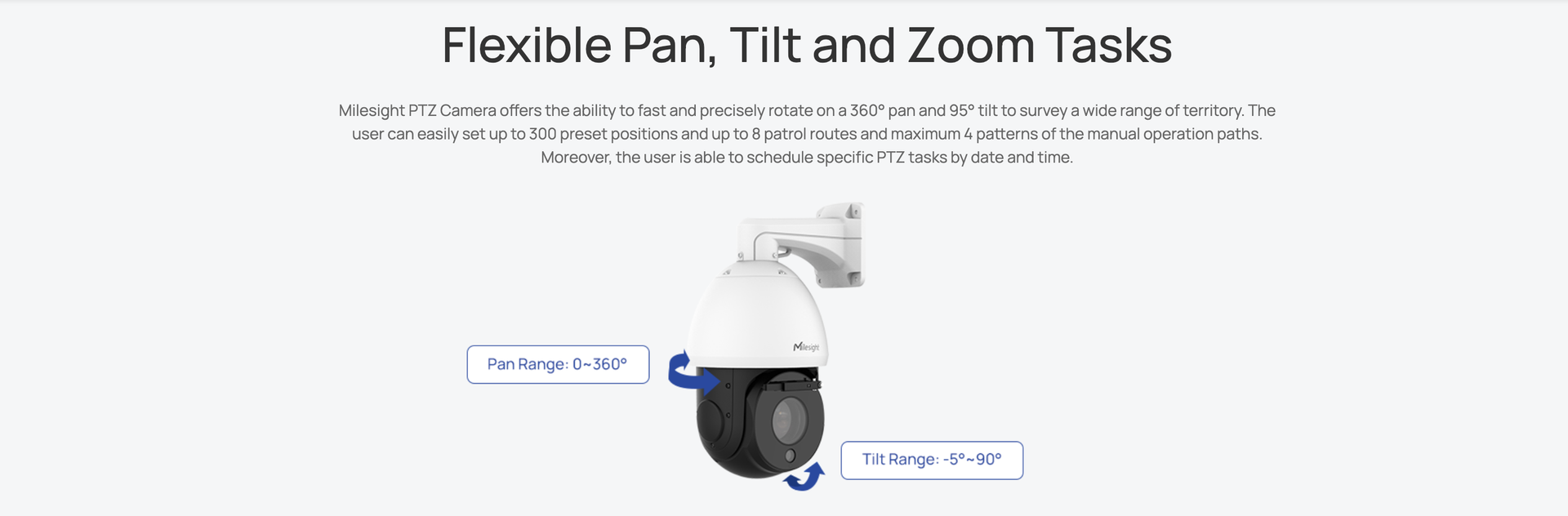 | Tilt Range/Tilt Speed | -5°~90°(Auto Flip) / Tilt Manual Speed: 0.1°~160°/s, Tilt Preset Speed: 160°/s |