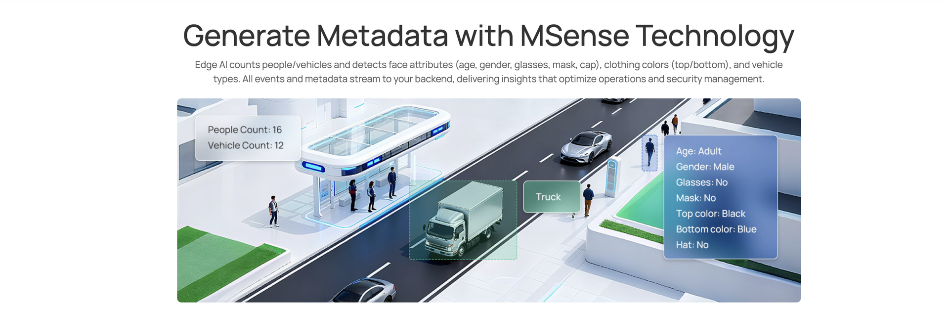 | Attribute Extraction | Simultaneously detect up to 50 targets and capture humans and vehicles in real time. Recognize attributes including Upper and Lower Clothing Color, Hat, and Vehicle Types (Bicycle, Car, Motorcycle, Bus, Truck, E-scooter). |