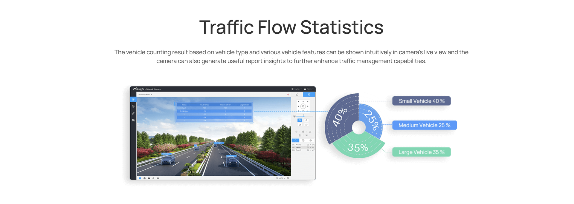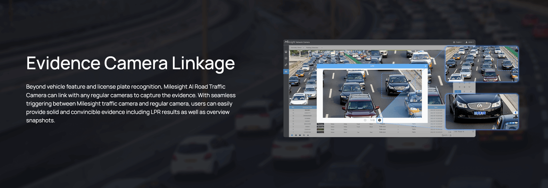 | Smart Traffic Function | Evidence Camera Linkage, Specific Lane Management, Vehicle Classification & Counting |